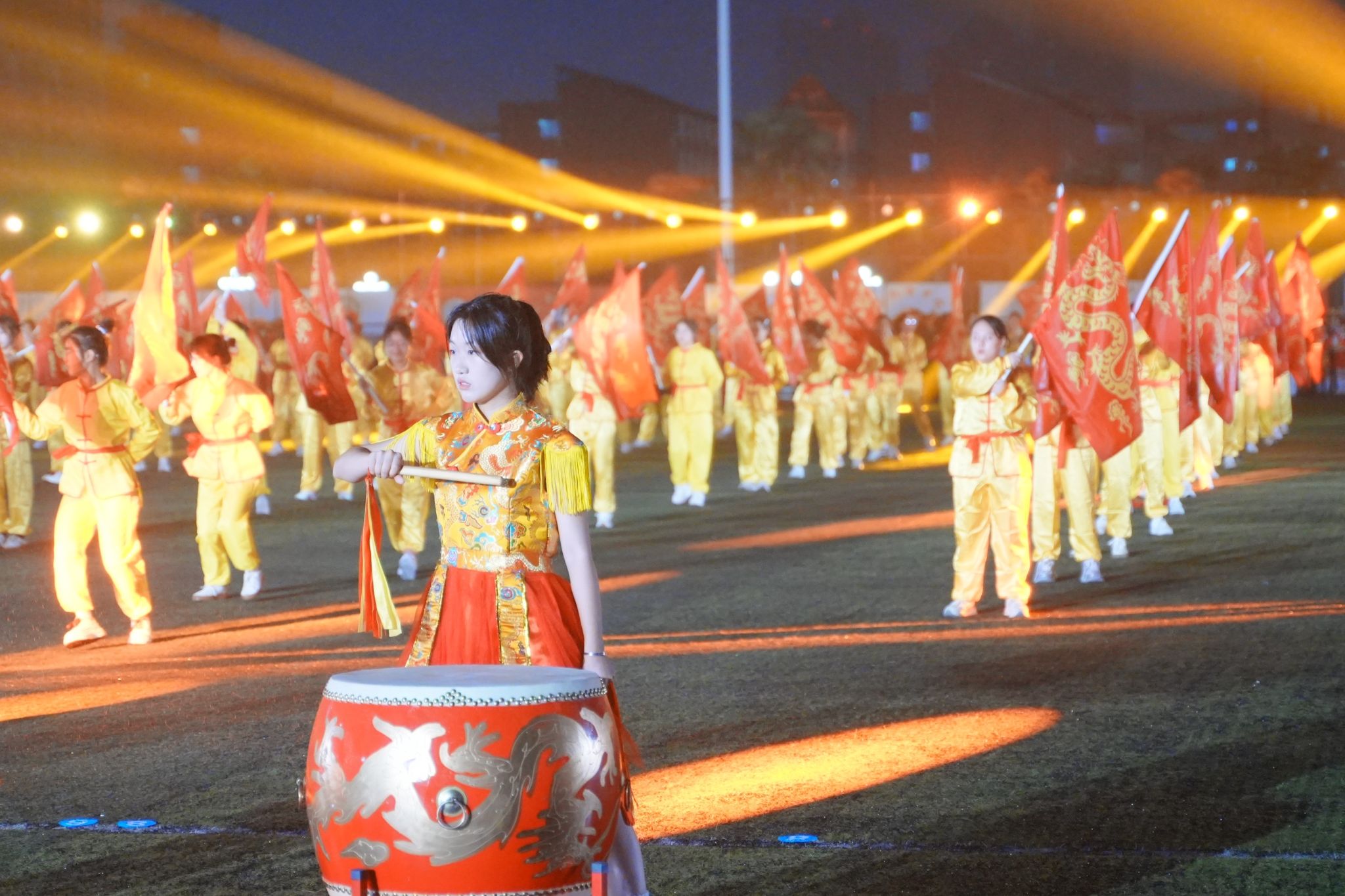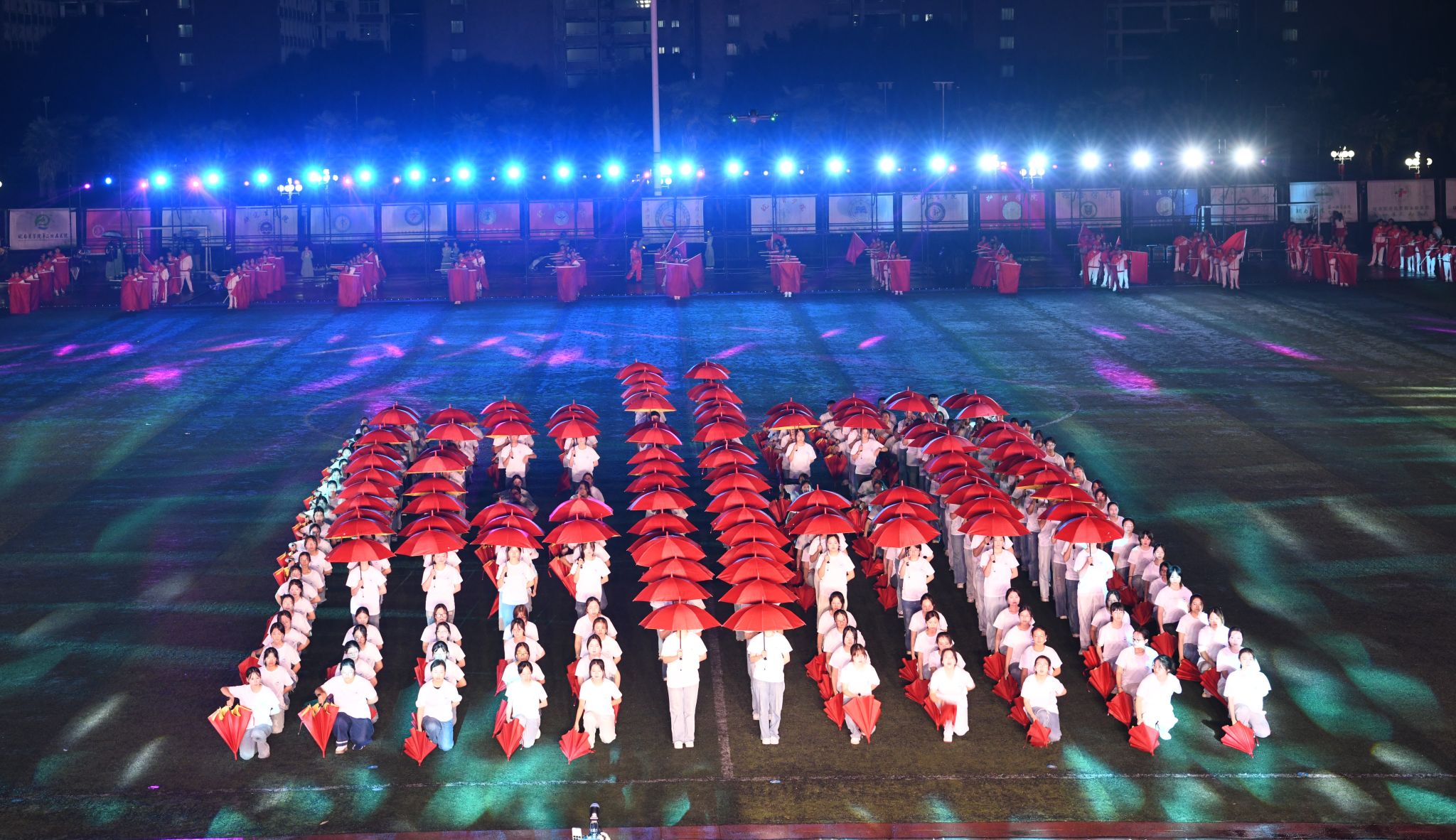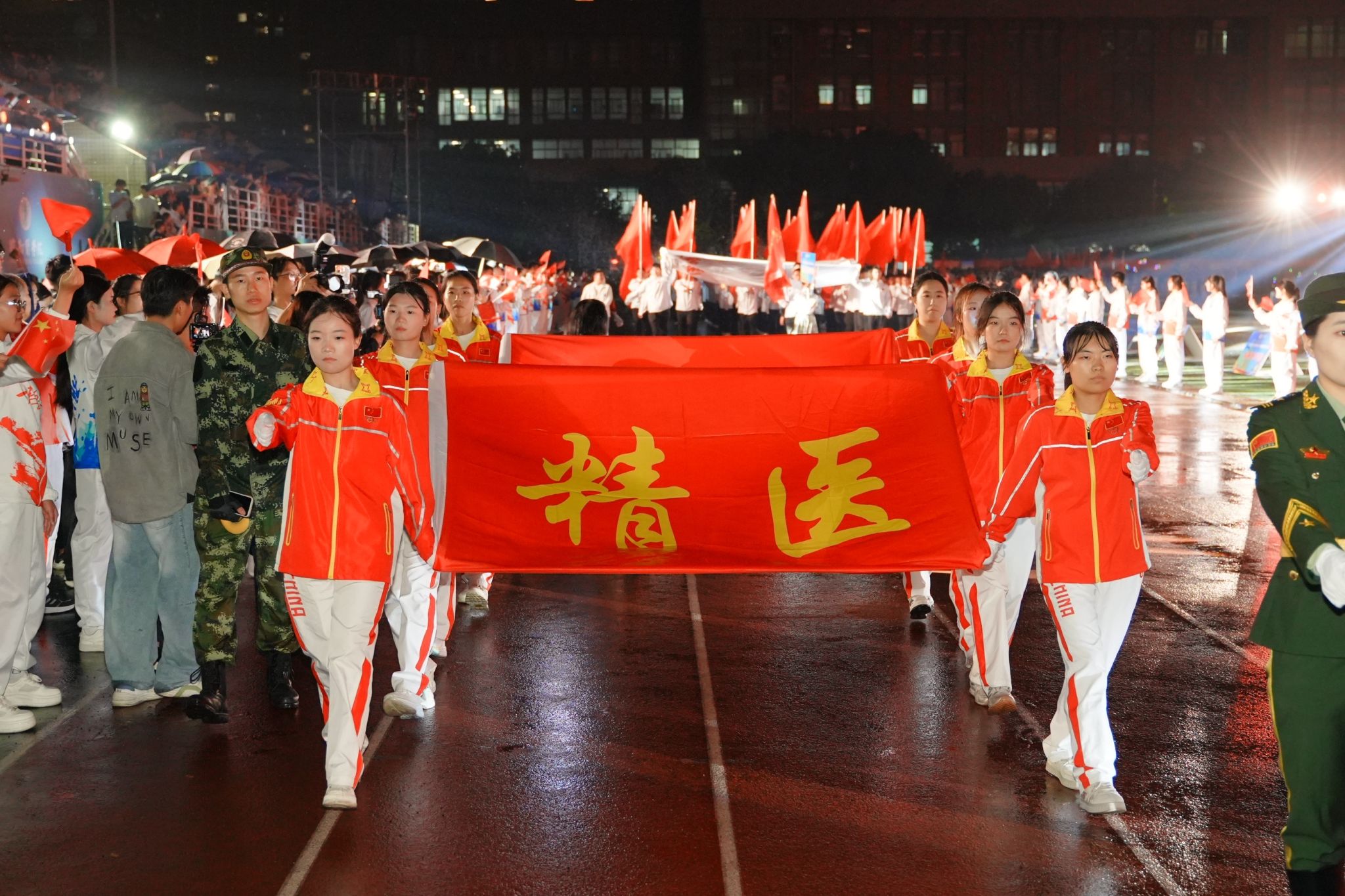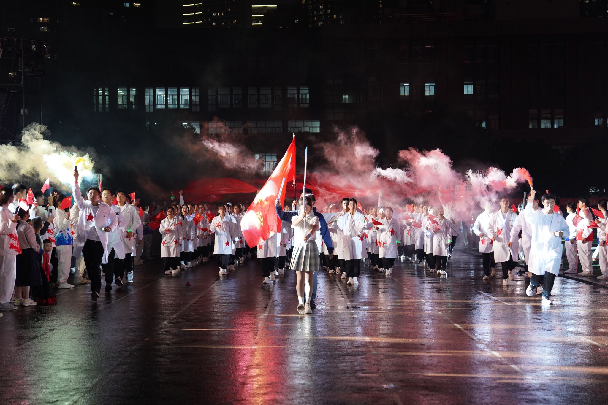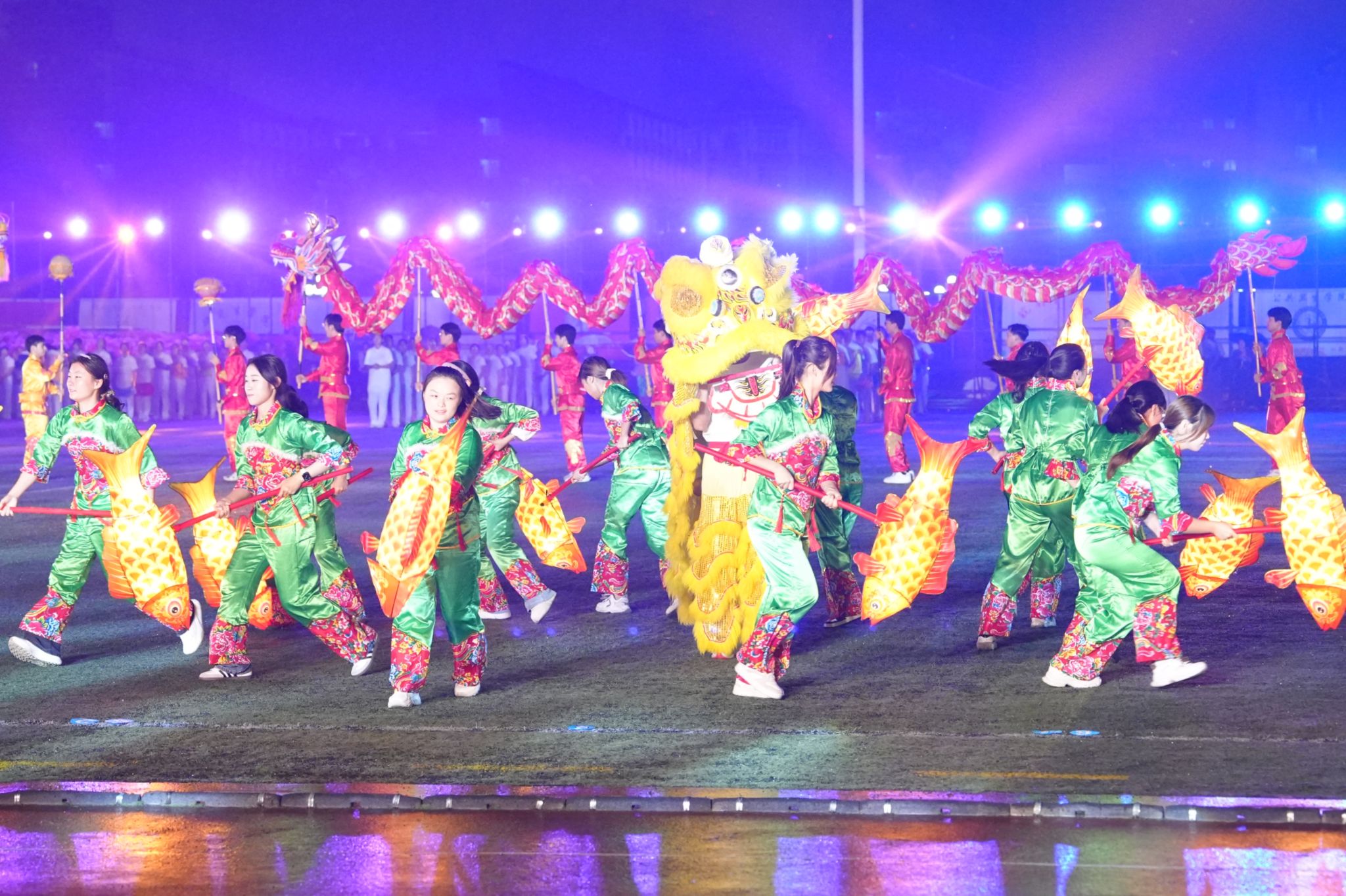 伴随着璀璨绚丽的灯光、欢快动感的旋律,精彩纷呈、声势浩大的文艺汇演让现场师生共同感受了一场力量与美感交融、青春与活力交织的视觉盛宴。此次文艺汇演分为“同心同行”“活力绽放”“共赴新程”三个篇章。鼓声激荡,直冲云霄;旗影翻飞,撼动乾坤,气势磅礴的舞蹈《旗鼓飞扬》拉开第一篇章的序幕,瞬间点燃了现场气氛。《龙狮跃鱼灯》将龙狮的磅礴威仪与鱼灯的灵动飘逸熔于一炉,把非遗传承与青春力量完美融合;主席台领导现场执笔为祥狮进行点睛,共同送上寓意深远的美好祝福。《舞动炫彩》通过彩带的灵动变幻,绽放出一朵朵绚烂的“太阳花”,展现出医学生用仁心守护每一个生命的绚烂绽放。第二篇章“活力绽放”中,《花样青春》通过“花”的生长脉络,生动勾勒大学生从青涩到成熟的成长历程,唱响“青春绽放、时代同行”的主旋律。《青春耀华夏》用“团体操+表演”的形式,结合纪念中国人民抗日战争暨世界反法西斯战争胜利80周年,激励青年学子铭记过往历史、传承红色基因。匕首操军体拳表演《利刃凌云》,将大学生的青春朝气与军人的铁血精神相融,一招一式尽显果敢与坚毅。第三篇章“共赴新程”,彰显了青年学子的爱国之情和对未来的美好祝愿。舞蹈《美丽中国》伞影婆娑,200余名学子通过伞的变化和组合拼出“我爱中国”,赤子之心跃然眼前;《旗开得胜》以旗为笔、以天地为画卷,勾勒出“旗如云、舞如风”的壮阔景象,传递着“旗开得胜”的美好寓意。《民族同心家国同辉》将56个民族的舞蹈元素与家国情怀深度融合,展现出各民族像石榴籽一样紧紧相拥的团结之美。此外,离退休老同志带来健身舞《花开中国》, 表达了老同志对祖国的无限深情和对美好生活的热爱。