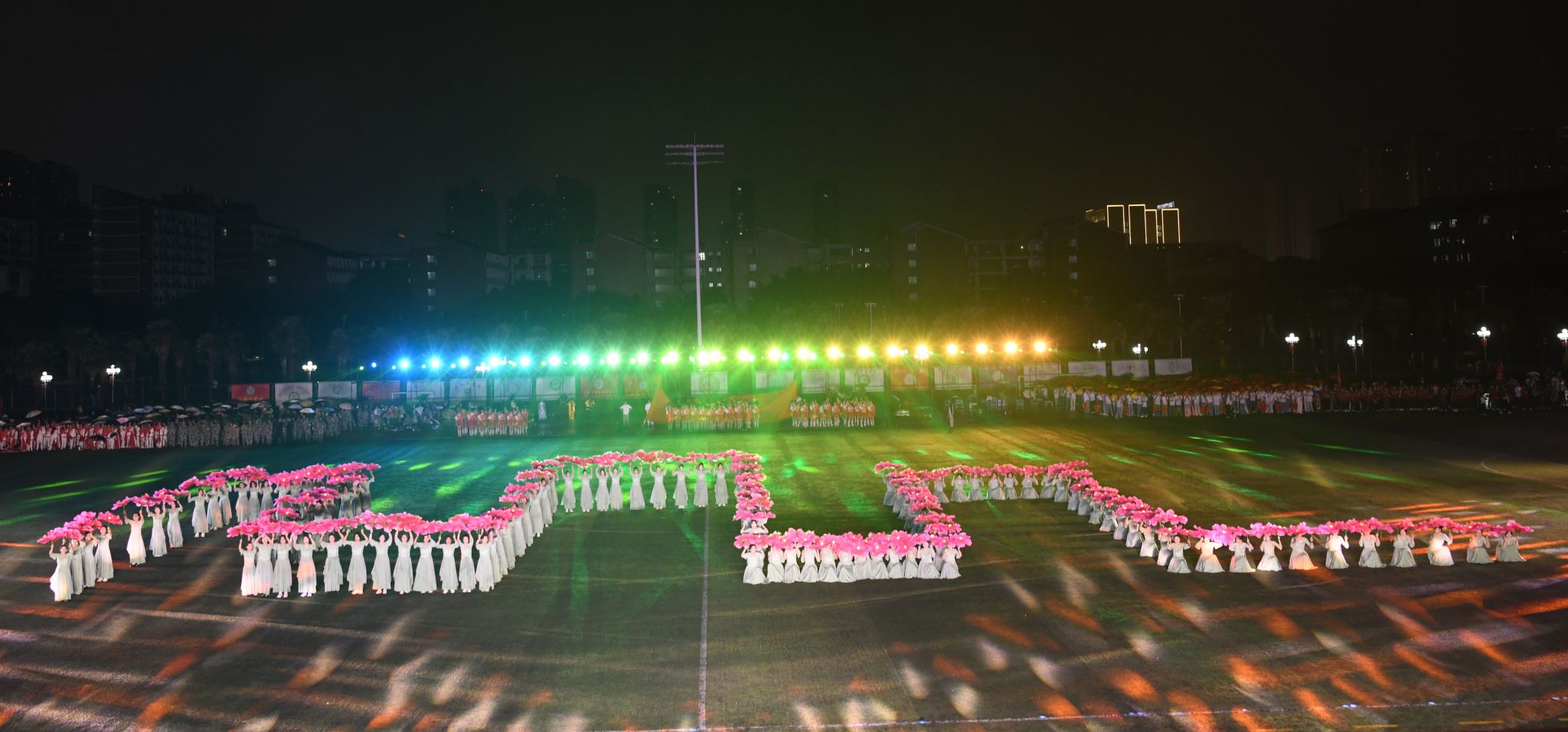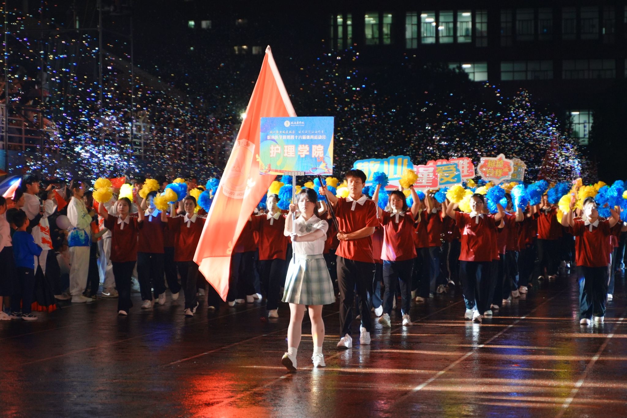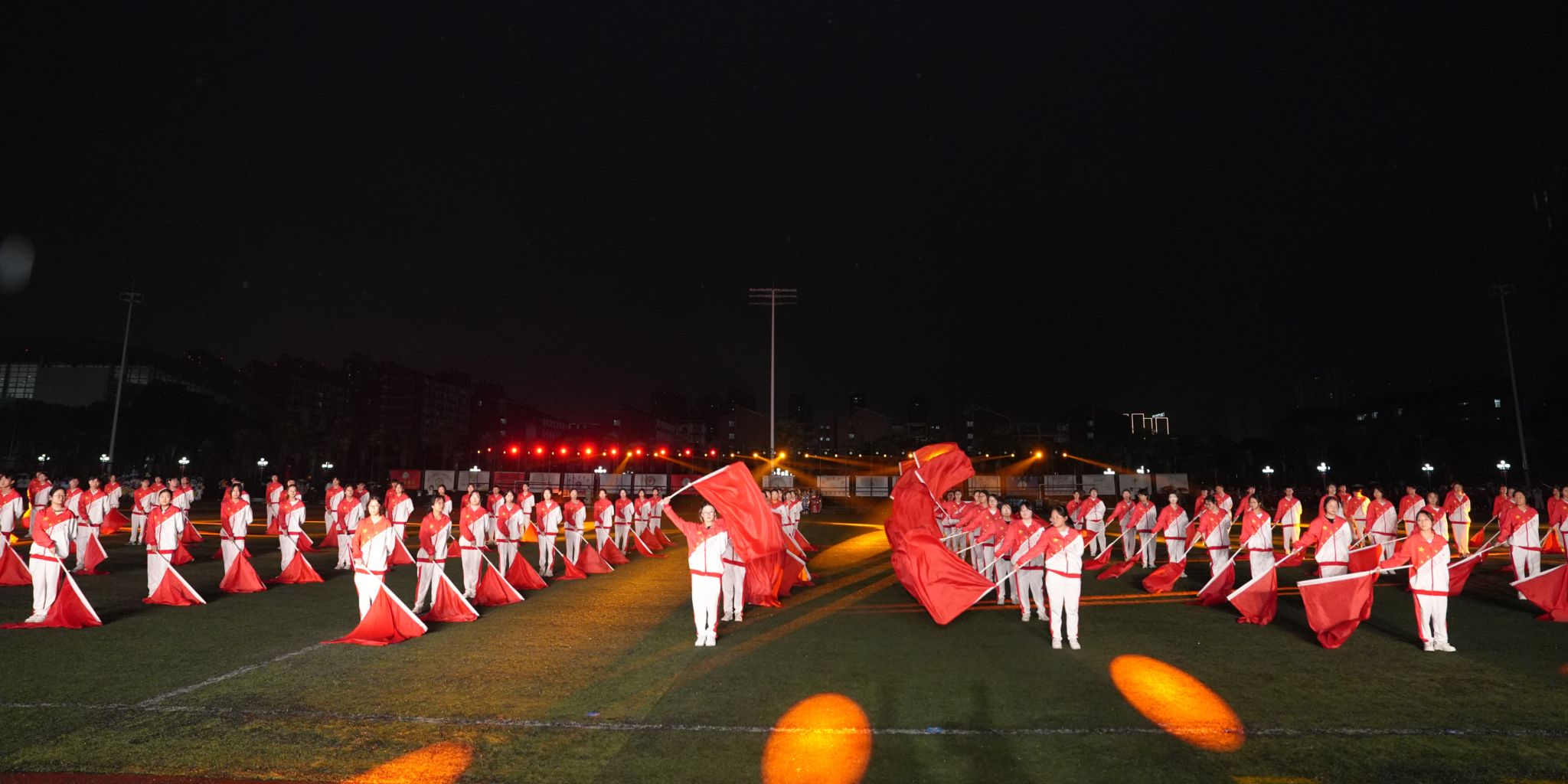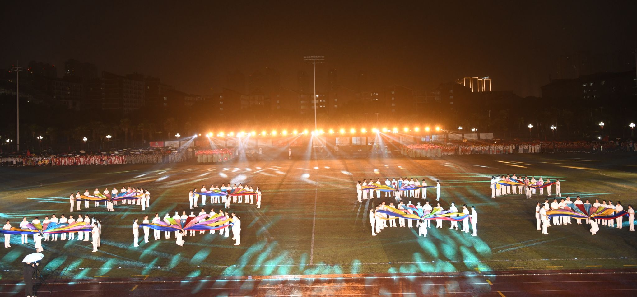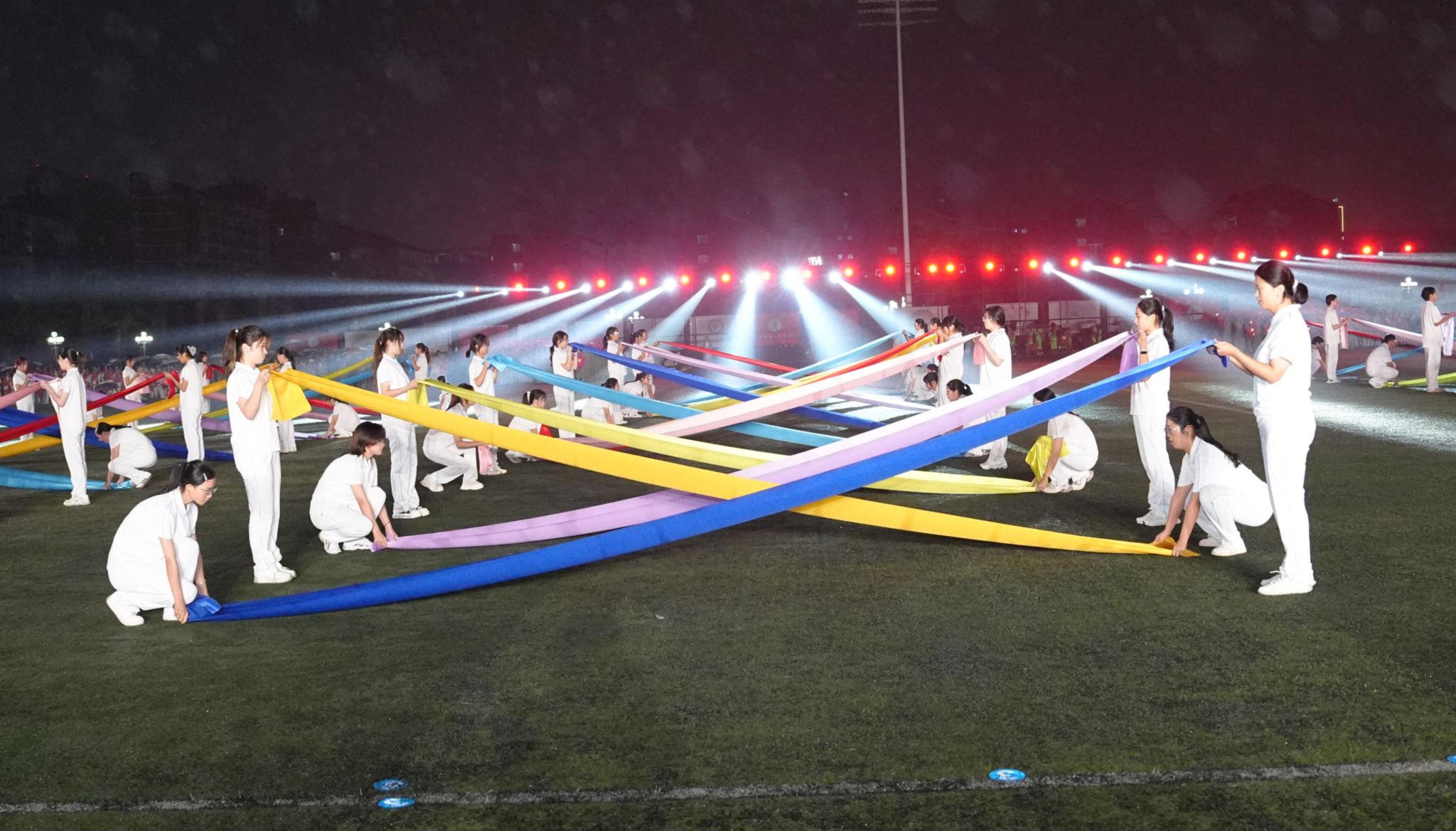 伴随着璀璨绚丽的灯光、欢快动感的旋律,精彩纷呈、声势浩大的文艺汇演让现场师生共同感受了一场力量与美感交融、青春与活力交织的视觉盛宴。此次文艺汇演分为“同心同行”“活力绽放”“共赴新程”三个篇章。鼓声激荡,直冲云霄;旗影翻飞,撼动乾坤,气势磅礴的舞蹈《旗鼓飞扬》拉开第一篇章的序幕,瞬间点燃了现场气氛。《龙狮跃鱼灯》将龙狮的磅礴威仪与鱼灯的灵动飘逸熔于一炉,把非遗传承与青春力量完美融合;主席台领导现场执笔为祥狮进行点睛,共同送上寓意深远的美好祝福。《舞动炫彩》通过彩带的灵动变幻,绽放出一朵朵绚烂的“太阳花”,展现出医学生用仁心守护每一个生命的绚烂绽放。第二篇章“活力绽放”中,《花样青春》通过“花”的生长脉络,生动勾勒大学生从青涩到成熟的成长历程,唱响“青春绽放、时代同行”的主旋律。《青春耀华夏》用“团体操+表演”的形式,结合纪念中国人民抗日战争暨世界反法西斯战争胜利80周年,激励青年学子铭记过往历史、传承红色基因。匕首操军体拳表演《利刃凌云》,将大学生的青春朝气与军人的铁血精神相融,一招一式尽显果敢与坚毅。第三篇章“共赴新程”,彰显了青年学子的爱国之情和对未来的美好祝愿。舞蹈《美丽中国》伞影婆娑,200余名学子通过伞的变化和组合拼出“我爱中国”,赤子之心跃然眼前;《旗开得胜》以旗为笔、以天地为画卷,勾勒出“旗如云、舞如风”的壮阔景象,传递着“旗开得胜”的美好寓意。《民族同心家国同辉》将56个民族的舞蹈元素与家国情怀深度融合,展现出各民族像石榴籽一样紧紧相拥的团结之美。此外,离退休老同志带来健身舞《花开中国》, 表达了老同志对祖国的无限深情和对美好生活的热爱。