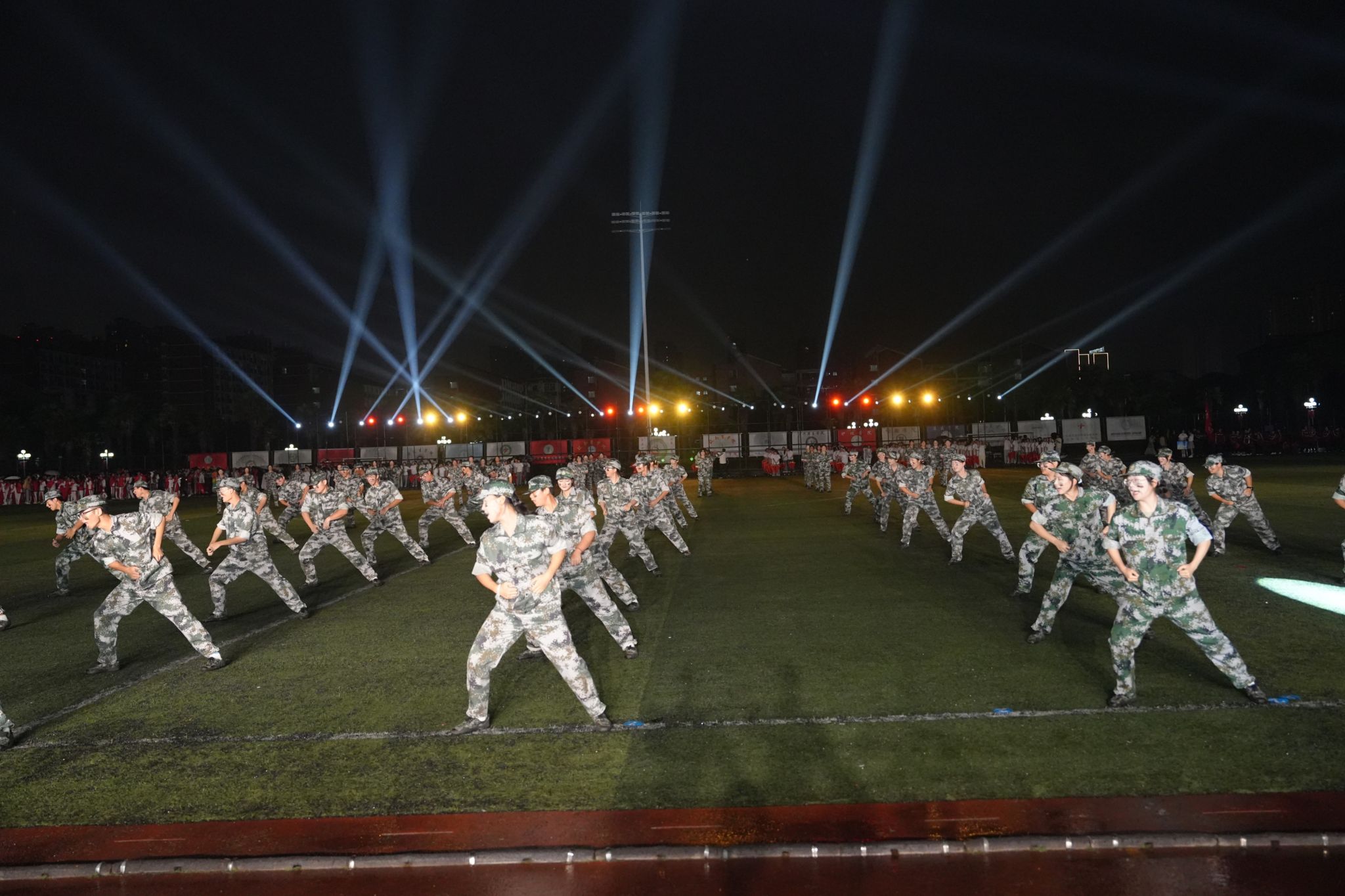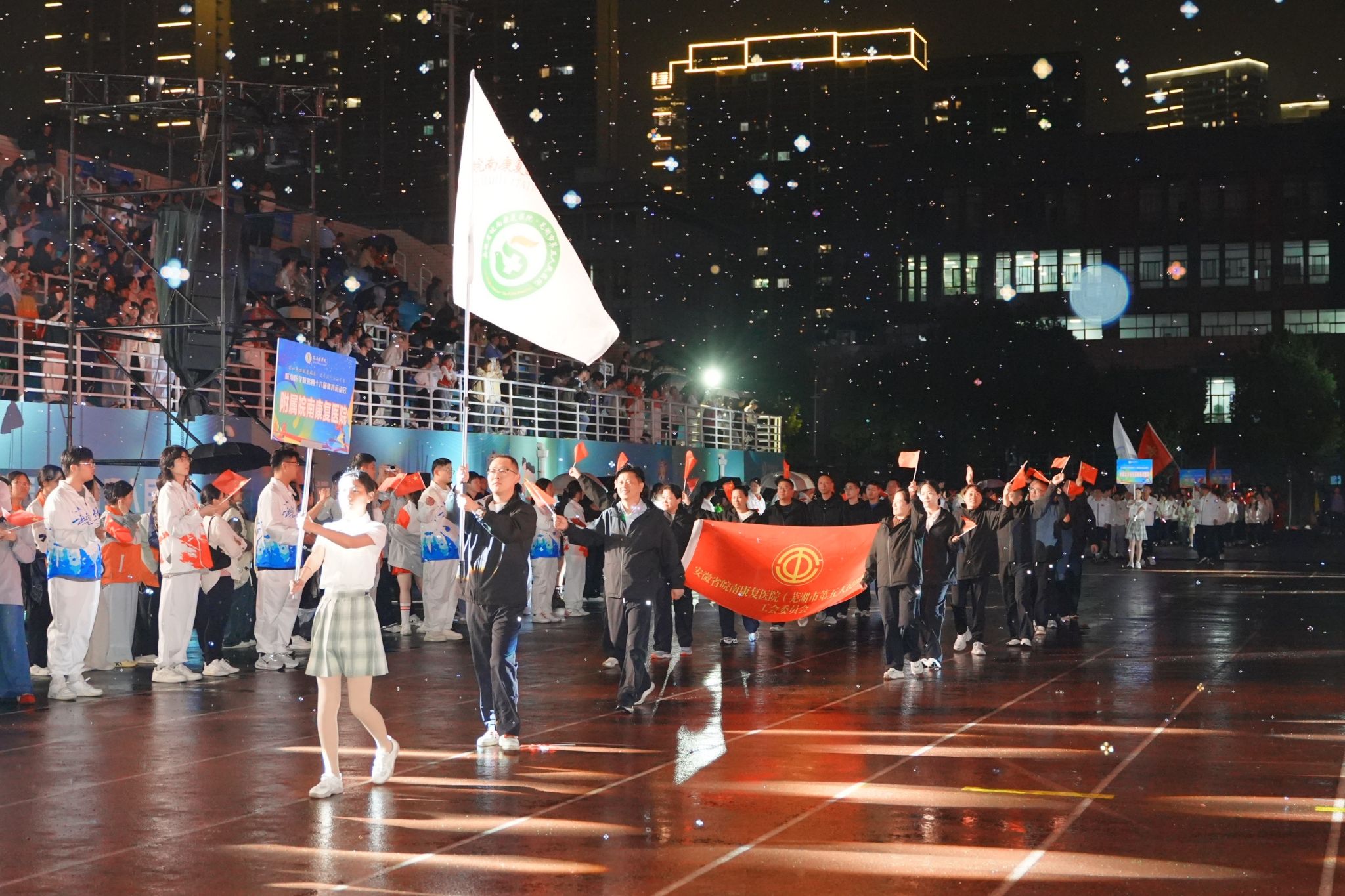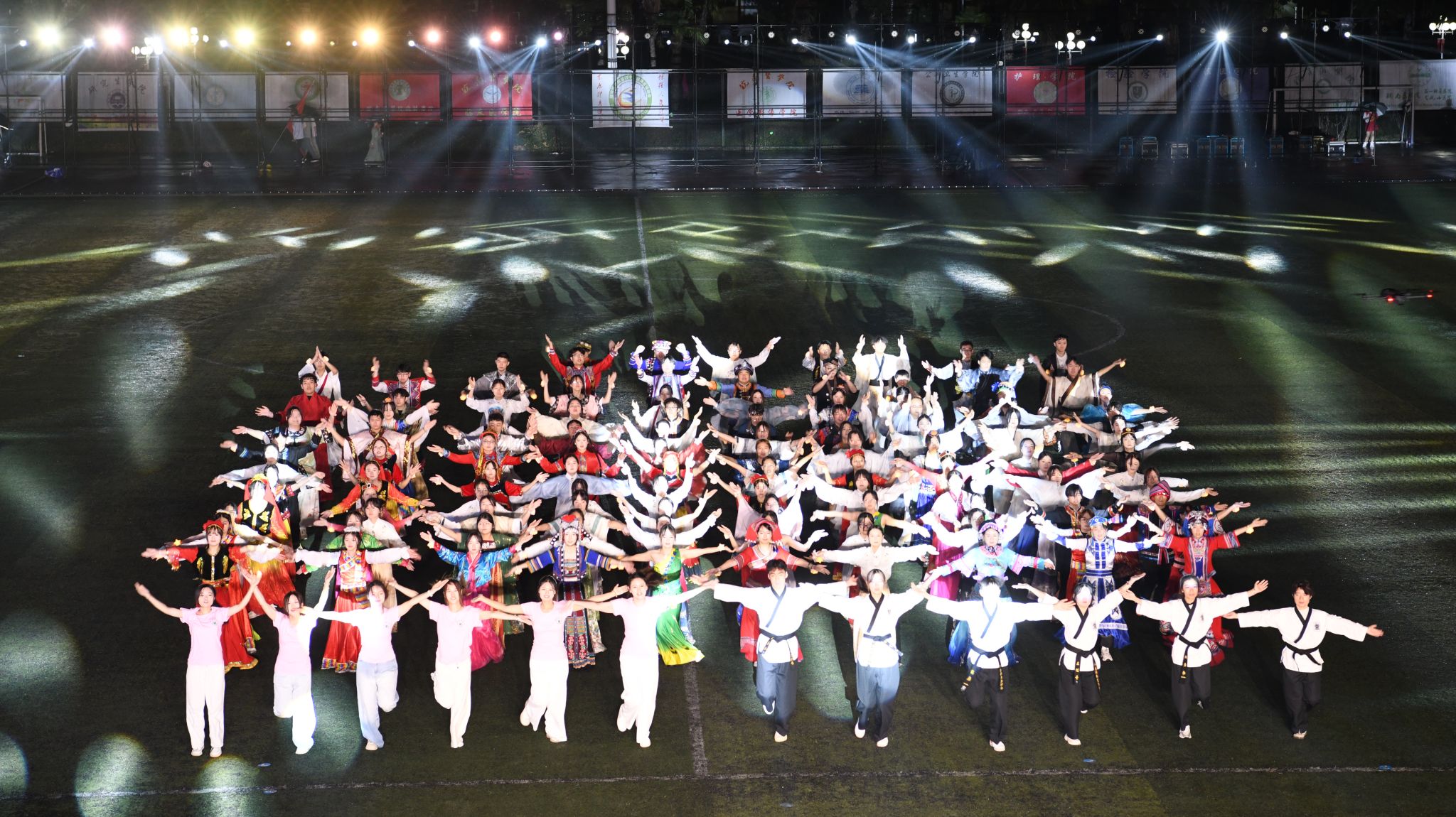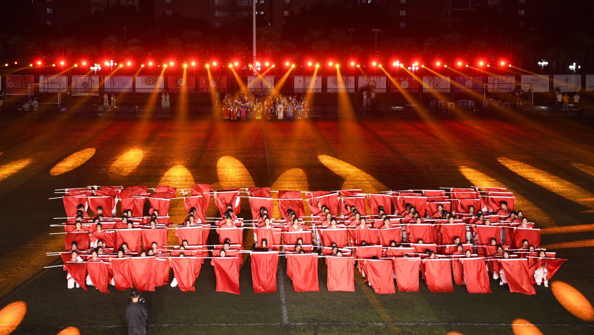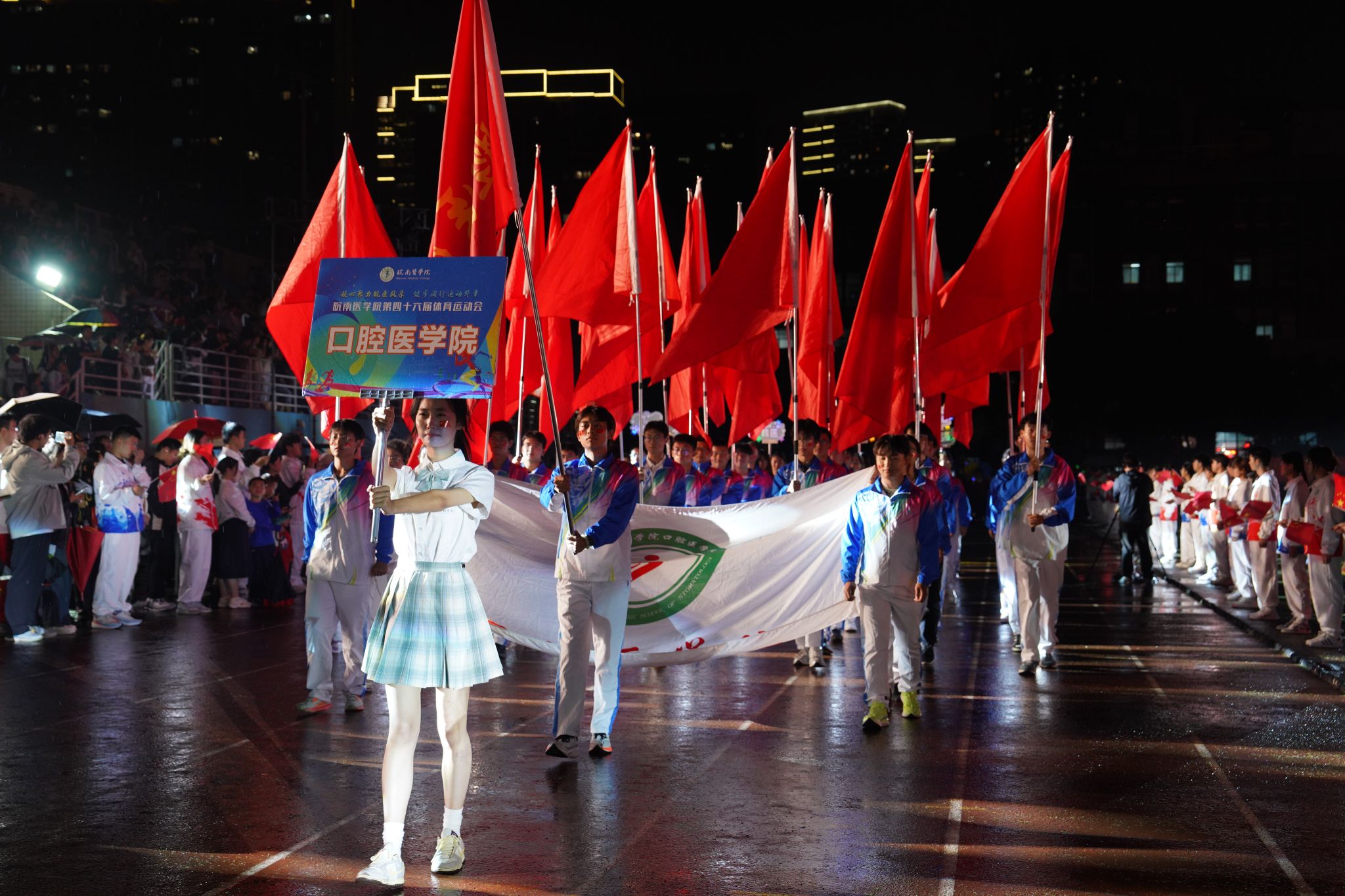 伴随着璀璨绚丽的灯光、欢快动感的旋律,精彩纷呈、声势浩大的文艺汇演让现场师生共同感受了一场力量与美感交融、青春与活力交织的视觉盛宴。此次文艺汇演分为“同心同行”“活力绽放”“共赴新程”三个篇章。鼓声激荡,直冲云霄;旗影翻飞,撼动乾坤,气势磅礴的舞蹈《旗鼓飞扬》拉开第一篇章的序幕,瞬间点燃了现场气氛。《龙狮跃鱼灯》将龙狮的磅礴威仪与鱼灯的灵动飘逸熔于一炉,把非遗传承与青春力量完美融合;主席台领导现场执笔为祥狮进行点睛,共同送上寓意深远的美好祝福。《舞动炫彩》通过彩带的灵动变幻,绽放出一朵朵绚烂的“太阳花”,展现出医学生用仁心守护每一个生命的绚烂绽放。第二篇章“活力绽放”中,《花样青春》通过“花”的生长脉络,生动勾勒大学生从青涩到成熟的成长历程,唱响“青春绽放、时代同行”的主旋律。《青春耀华夏》用“团体操+表演”的形式,结合纪念中国人民抗日战争暨世界反法西斯战争胜利80周年,激励青年学子铭记过往历史、传承红色基因。匕首操军体拳表演《利刃凌云》,将大学生的青春朝气与军人的铁血精神相融,一招一式尽显果敢与坚毅。第三篇章“共赴新程”,彰显了青年学子的爱国之情和对未来的美好祝愿。舞蹈《美丽中国》伞影婆娑,200余名学子通过伞的变化和组合拼出“我爱中国”,赤子之心跃然眼前;《旗开得胜》以旗为笔、以天地为画卷,勾勒出“旗如云、舞如风”的壮阔景象,传递着“旗开得胜”的美好寓意。《民族同心家国同辉》将56个民族的舞蹈元素与家国情怀深度融合,展现出各民族像石榴籽一样紧紧相拥的团结之美。此外,离退休老同志带来健身舞《花开中国》, 表达了老同志对祖国的无限深情和对美好生活的热爱。