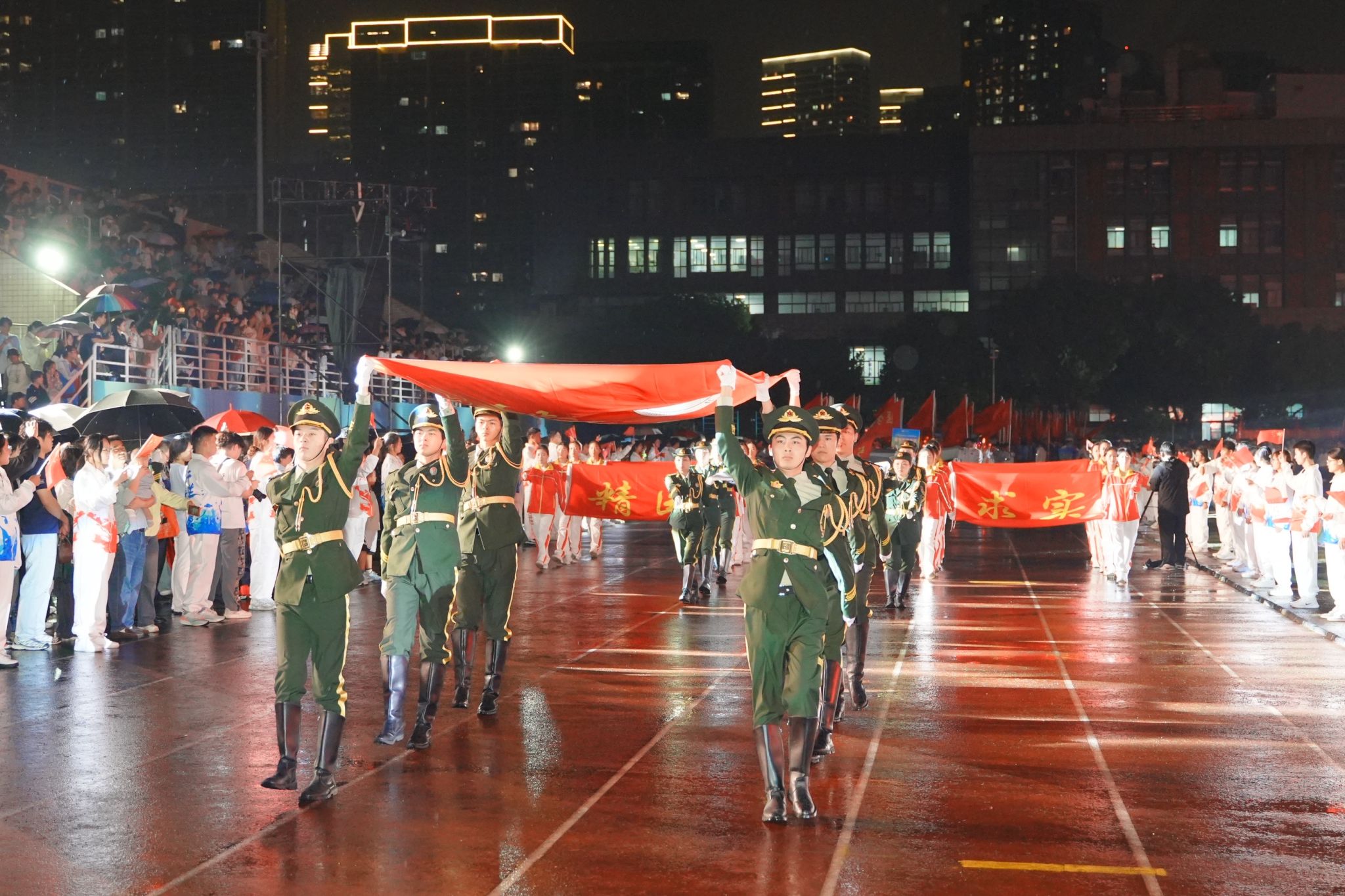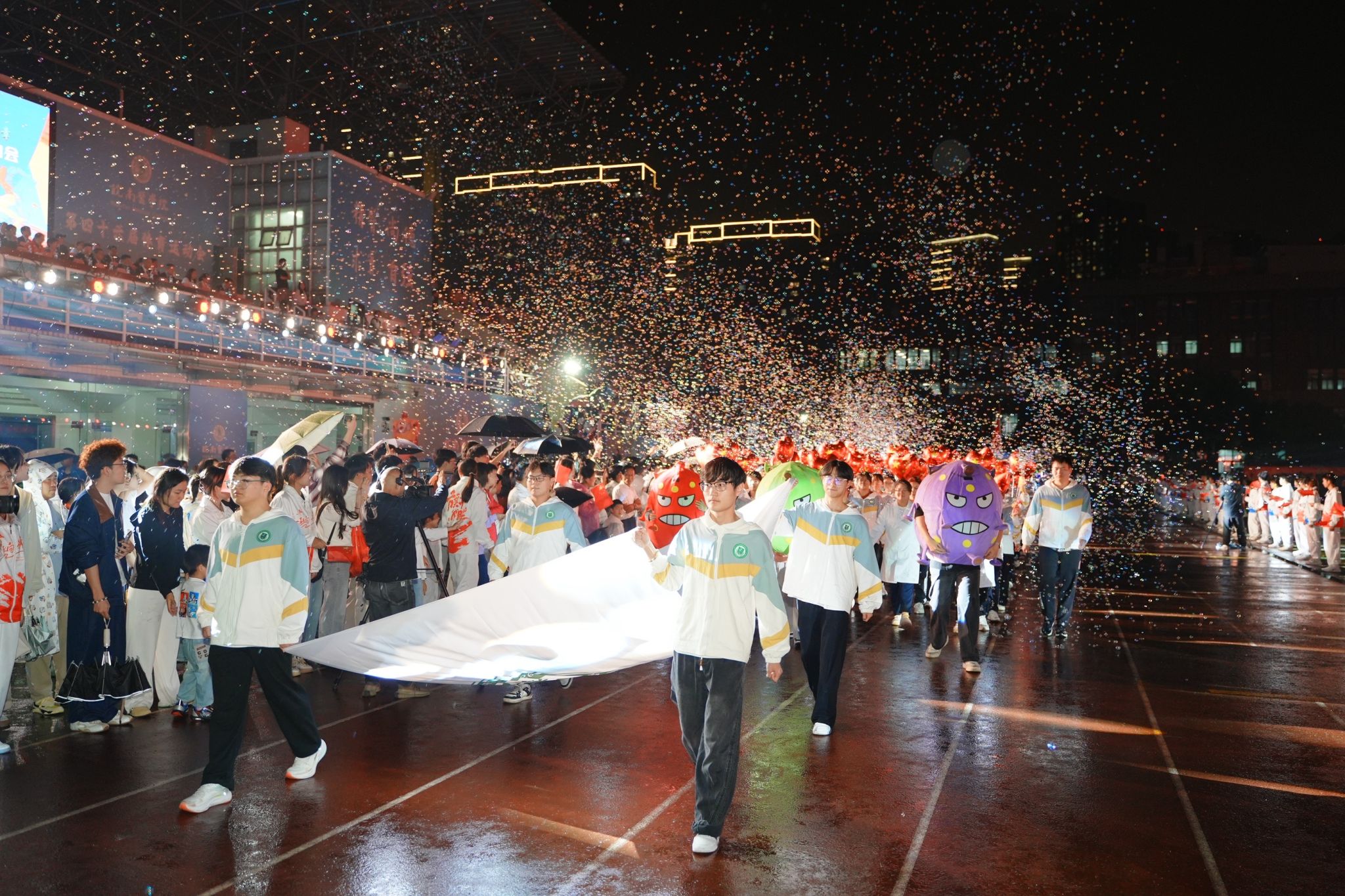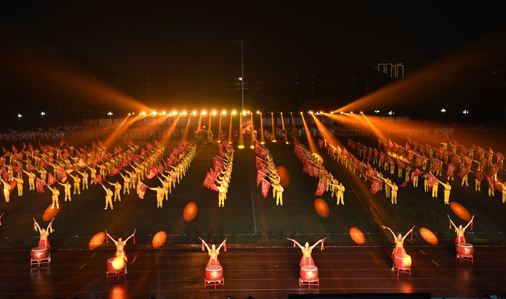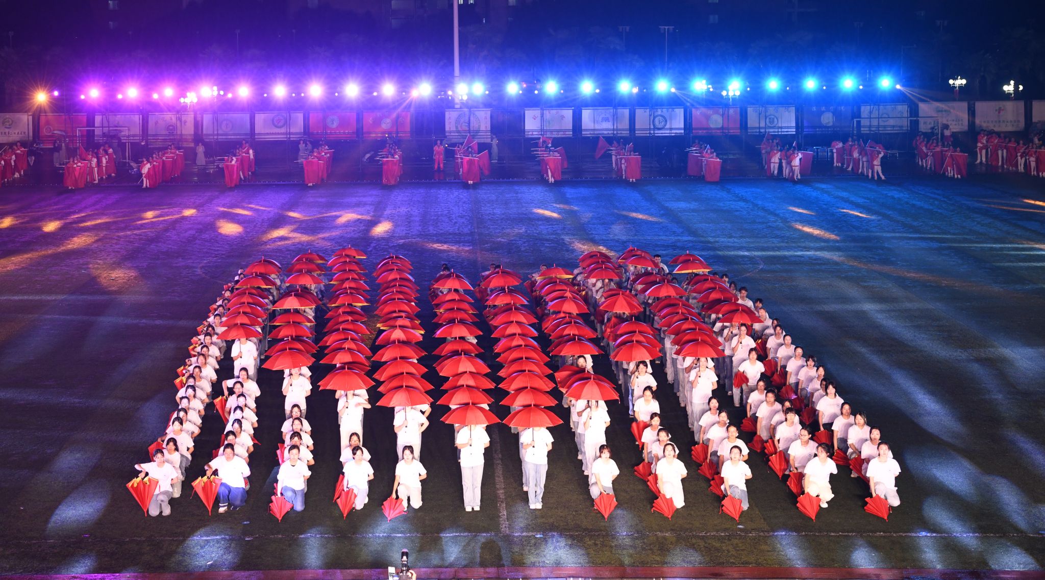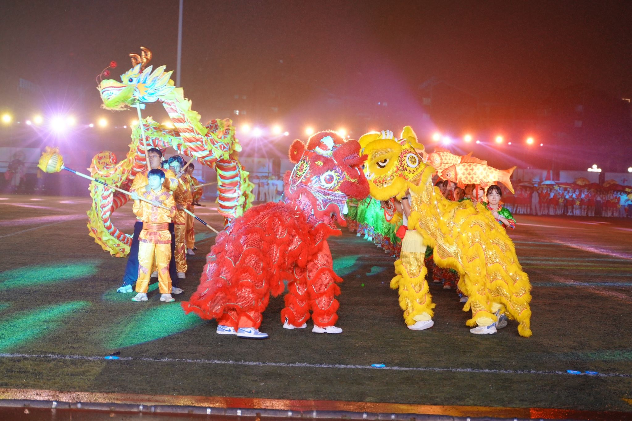 伴随着璀璨绚丽的灯光、欢快动感的旋律,精彩纷呈、声势浩大的文艺汇演让现场师生共同感受了一场力量与美感交融、青春与活力交织的视觉盛宴。此次文艺汇演分为“同心同行”“活力绽放”“共赴新程”三个篇章。鼓声激荡,直冲云霄;旗影翻飞,撼动乾坤,气势磅礴的舞蹈《旗鼓飞扬》拉开第一篇章的序幕,瞬间点燃了现场气氛。《龙狮跃鱼灯》将龙狮的磅礴威仪与鱼灯的灵动飘逸熔于一炉,把非遗传承与青春力量完美融合;主席台领导现场执笔为祥狮进行点睛,共同送上寓意深远的美好祝福。《舞动炫彩》通过彩带的灵动变幻,绽放出一朵朵绚烂的“太阳花”,展现出医学生用仁心守护每一个生命的绚烂绽放。第二篇章“活力绽放”中,《花样青春》通过“花”的生长脉络,生动勾勒大学生从青涩到成熟的成长历程,唱响“青春绽放、时代同行”的主旋律。《青春耀华夏》用“团体操+表演”的形式,结合纪念中国人民抗日战争暨世界反法西斯战争胜利80周年,激励青年学子铭记过往历史、传承红色基因。匕首操军体拳表演《利刃凌云》,将大学生的青春朝气与军人的铁血精神相融,一招一式尽显果敢与坚毅。第三篇章“共赴新程”,彰显了青年学子的爱国之情和对未来的美好祝愿。舞蹈《美丽中国》伞影婆娑,200余名学子通过伞的变化和组合拼出“我爱中国”,赤子之心跃然眼前;《旗开得胜》以旗为笔、以天地为画卷,勾勒出“旗如云、舞如风”的壮阔景象,传递着“旗开得胜”的美好寓意。《民族同心家国同辉》将56个民族的舞蹈元素与家国情怀深度融合,展现出各民族像石榴籽一样紧紧相拥的团结之美。此外,离退休老同志带来健身舞《花开中国》, 表达了老同志对祖国的无限深情和对美好生活的热爱。