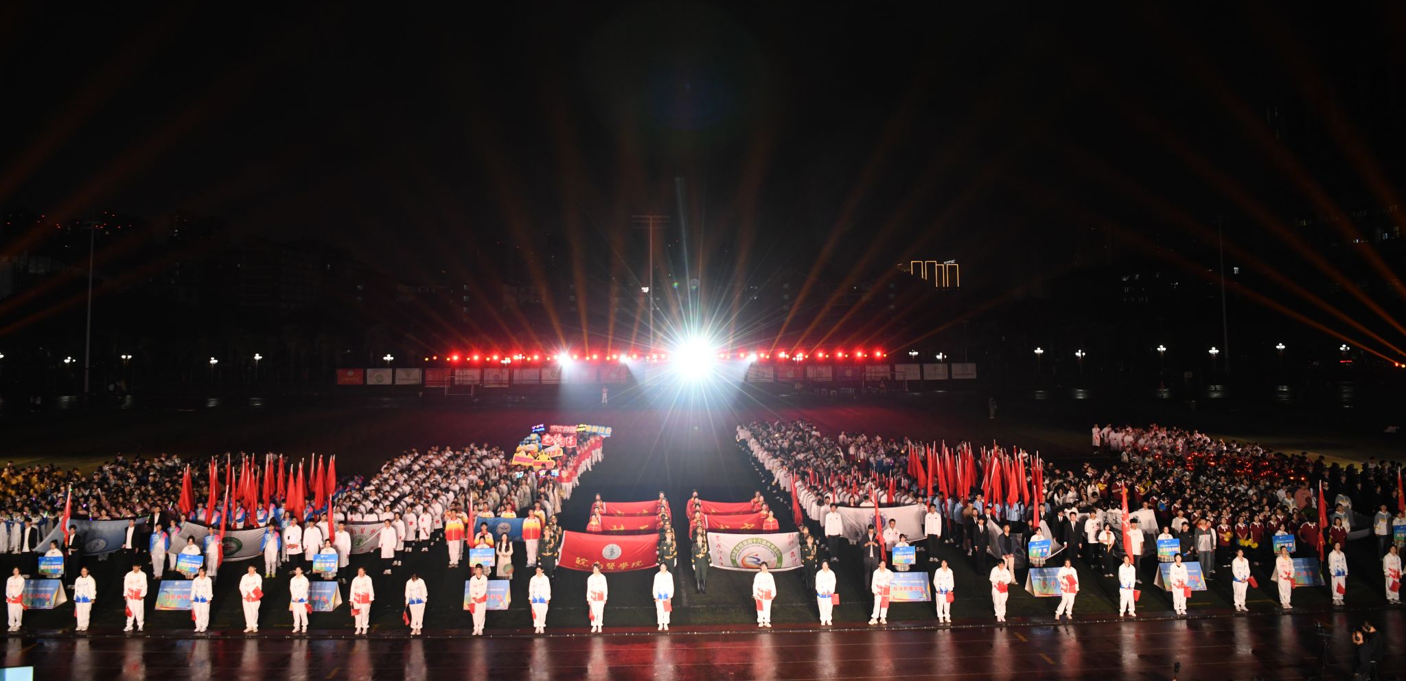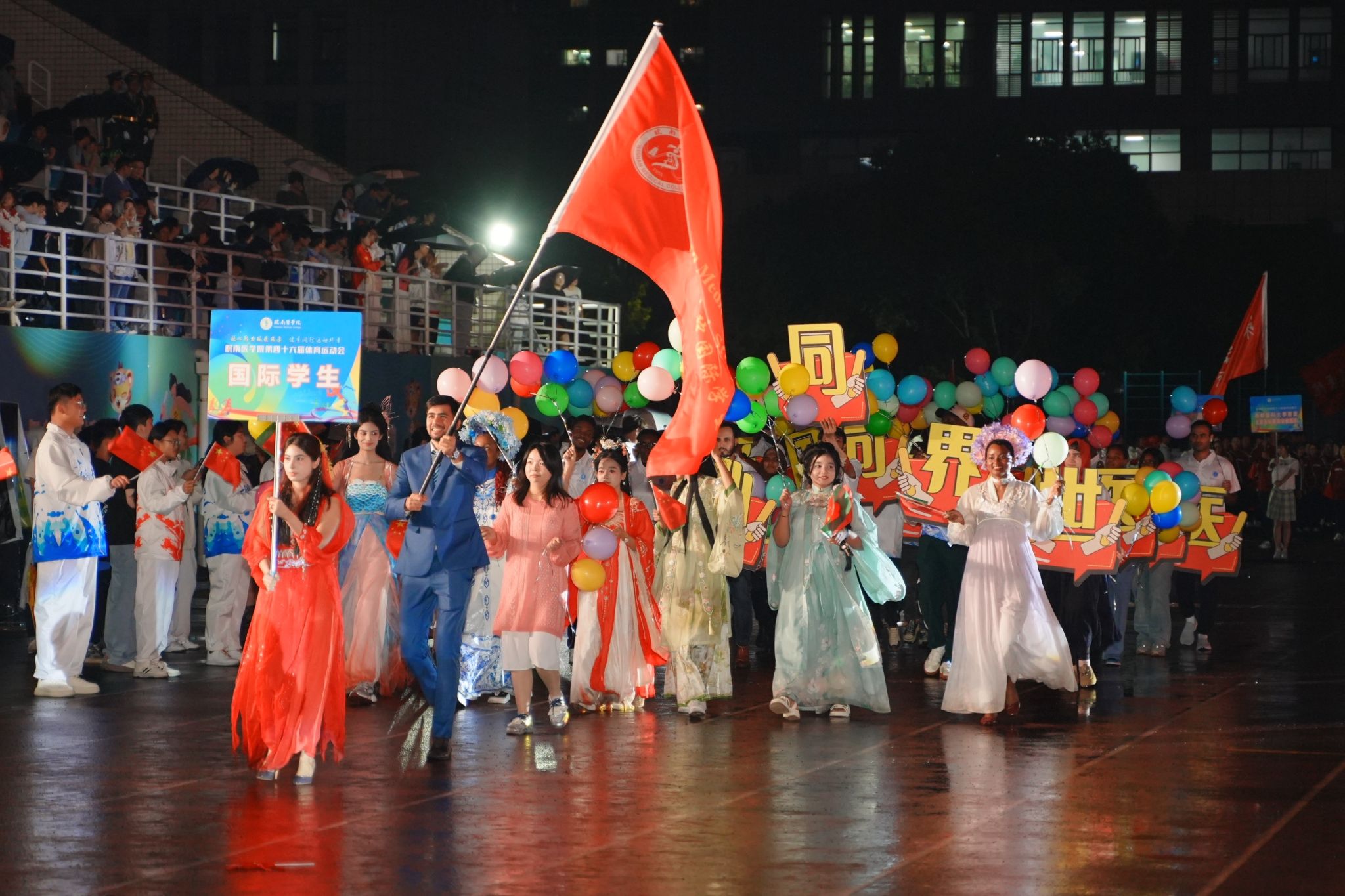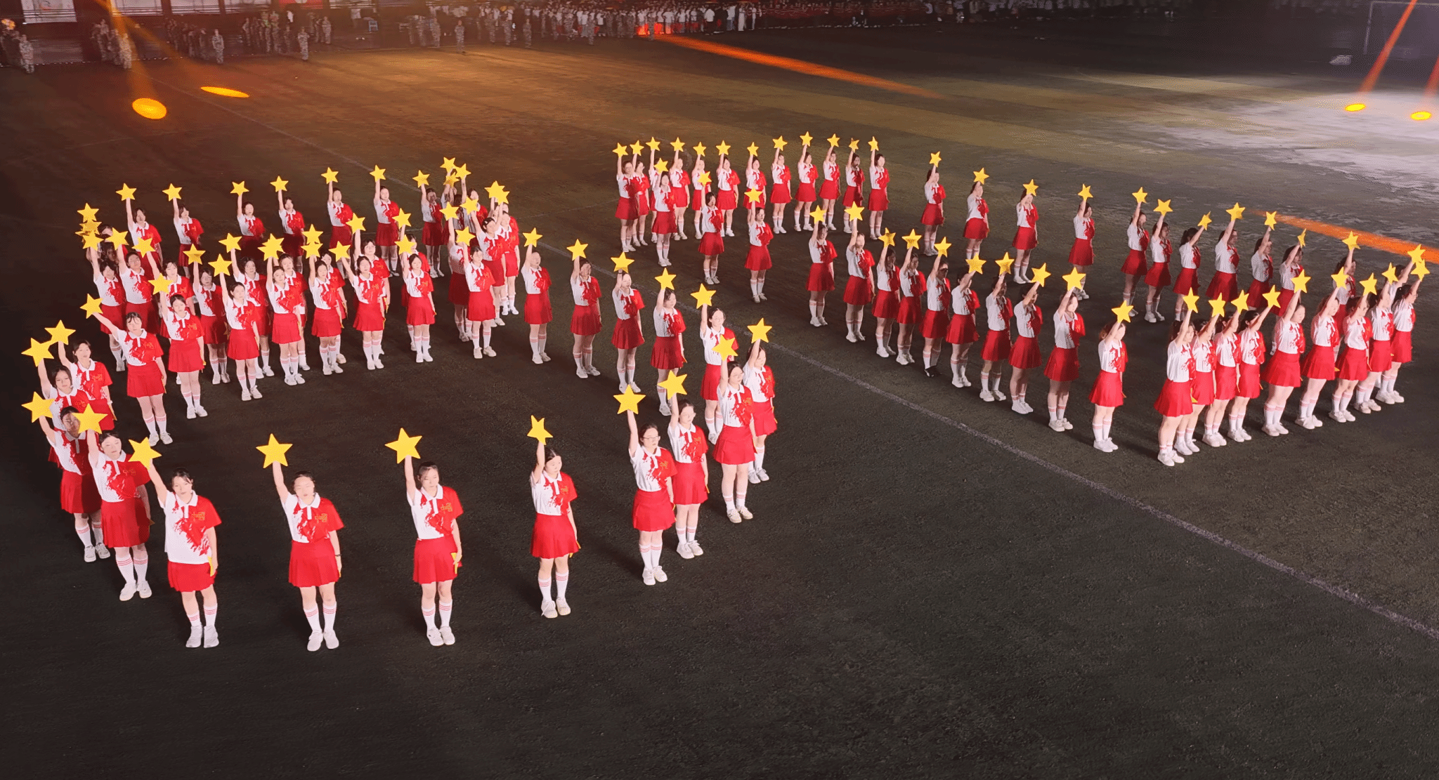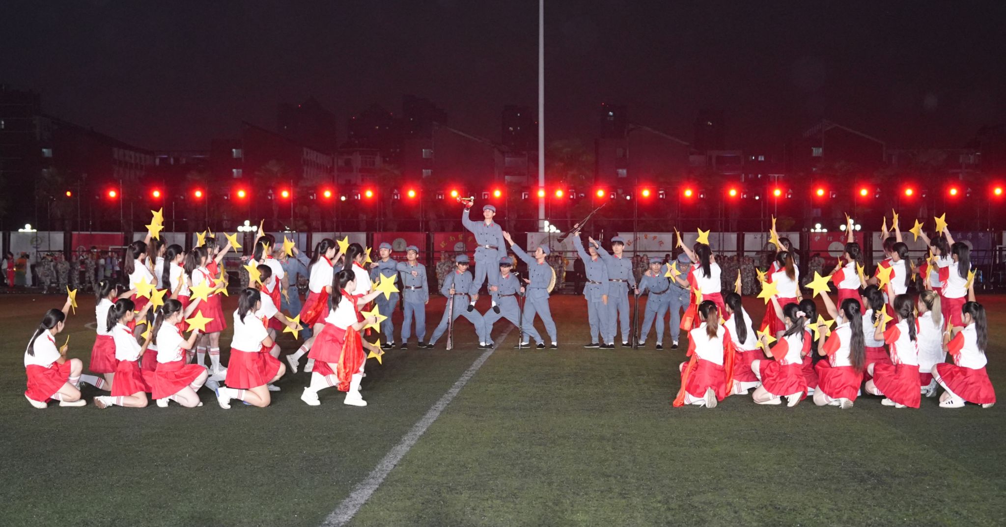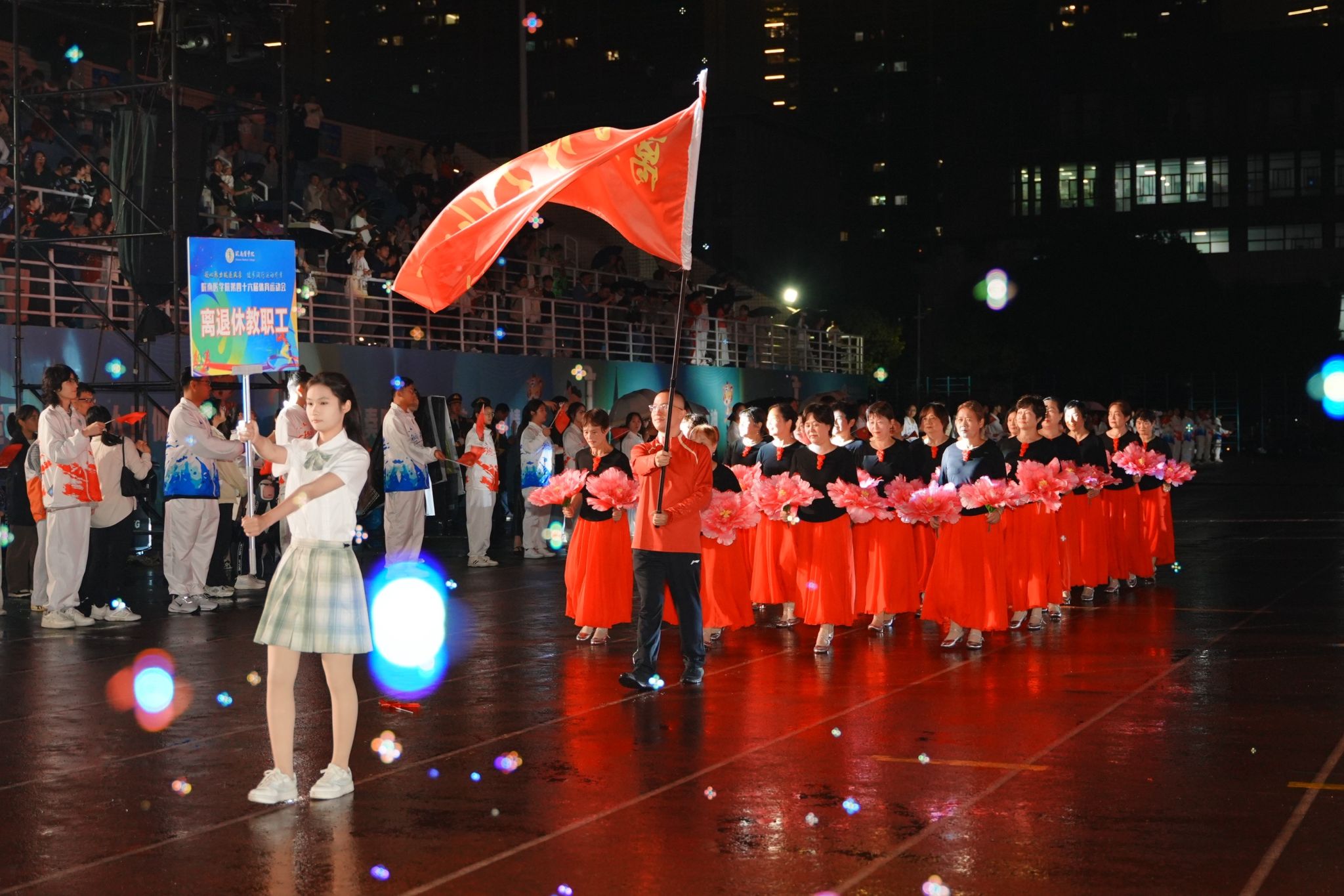 伴随着璀璨绚丽的灯光、欢快动感的旋律,精彩纷呈、声势浩大的文艺汇演让现场师生共同感受了一场力量与美感交融、青春与活力交织的视觉盛宴。此次文艺汇演分为“同心同行”“活力绽放”“共赴新程”三个篇章。鼓声激荡,直冲云霄;旗影翻飞,撼动乾坤,气势磅礴的舞蹈《旗鼓飞扬》拉开第一篇章的序幕,瞬间点燃了现场气氛。《龙狮跃鱼灯》将龙狮的磅礴威仪与鱼灯的灵动飘逸熔于一炉,把非遗传承与青春力量完美融合;主席台领导现场执笔为祥狮进行点睛,共同送上寓意深远的美好祝福。《舞动炫彩》通过彩带的灵动变幻,绽放出一朵朵绚烂的“太阳花”,展现出医学生用仁心守护每一个生命的绚烂绽放。第二篇章“活力绽放”中,《花样青春》通过“花”的生长脉络,生动勾勒大学生从青涩到成熟的成长历程,唱响“青春绽放、时代同行”的主旋律。《青春耀华夏》用“团体操+表演”的形式,结合纪念中国人民抗日战争暨世界反法西斯战争胜利80周年,激励青年学子铭记过往历史、传承红色基因。匕首操军体拳表演《利刃凌云》,将大学生的青春朝气与军人的铁血精神相融,一招一式尽显果敢与坚毅。第三篇章“共赴新程”,彰显了青年学子的爱国之情和对未来的美好祝愿。舞蹈《美丽中国》伞影婆娑,200余名学子通过伞的变化和组合拼出“我爱中国”,赤子之心跃然眼前;《旗开得胜》以旗为笔、以天地为画卷,勾勒出“旗如云、舞如风”的壮阔景象,传递着“旗开得胜”的美好寓意。《民族同心家国同辉》将56个民族的舞蹈元素与家国情怀深度融合,展现出各民族像石榴籽一样紧紧相拥的团结之美。此外,离退休老同志带来健身舞《花开中国》, 表达了老同志对祖国的无限深情和对美好生活的热爱。