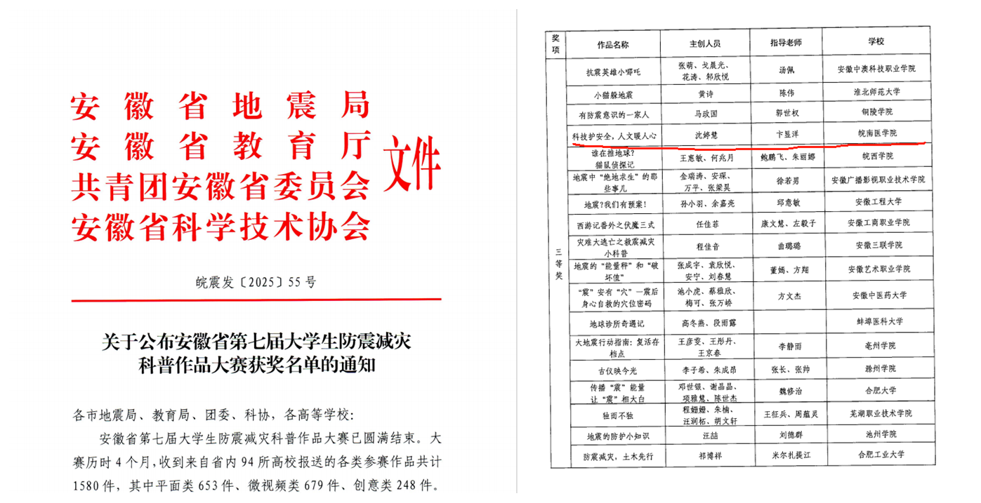 近日,由安徽省地震局、省教育厅、共青团安徽省委员会、省科学技术协会主办,省地理信息中心和省地震学会承办的安徽省第七届大学生防震减灾科普作品大赛落下帷幕,我校基础医学院2023基础医学专业沈婷慧同学提交的作品从众多优秀作品中脱颖而出,获大赛三等奖,展现了我校学子扎实的专业素养、丰富的创新能力和强烈的社会责任意识。